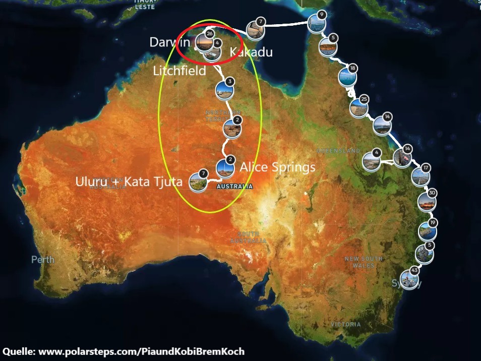 Von Darwin aus wollten wir die Nationalparks (NP) Litchfield und Kakadu besuchen, und dazwischen einen Abstecher südlich bis Katherine machen (rote Route auf dem Bild unten). Aber es kommt anders. Am Vorabend unserer Reise treffen wir Margrit und Ernst von der SY Kama, die gerade von ihrer Reise ins Outback zurückgekommen sind. Als wir über unsere Reisepläne sprechen, meint Ernst schulterzuckend: «Ja, die Wasserfälle sind schön, aber einmal hat man sie gesehen.» Noch am selben Abend schaue ich mir die Karte zum wiederholten Mal an. Und da ist er wieder, der Uluru (bis 1993 Ayers Rock genannt). Schon immer wollte ich irgendeinmal in meinem Leben dorthin. Aber über 3’300 Kilometer Umweg? Für mich kein Problem, ich fahre sehr gerne Auto. Aber Pia – ob sie das mitmacht? Da ist Taktik und Strategie gefragt. Am Abend des 2. Tages im ersten Nationalpark mit wunderschönen Wasserfällen und fantastischer Natur erwähne ich ganz beiläufig meine verrückte Idee, bis zum Uluru zu fahren. Ich stelle das einfach mal so in den Raum und unterlasse es tunlichst, das Thema weiter zu diskutieren. In der folgenden Nacht schläft Pia sehr unruhige, denkt nach und träumt sogar vom Uluru. Beim Frühstück am nächsten Morgen wird die verrückte Idee zum gemeinsamen Plan: Wir machen einen Abstecher zum Uluru.