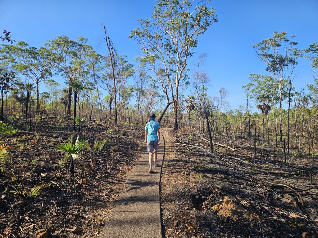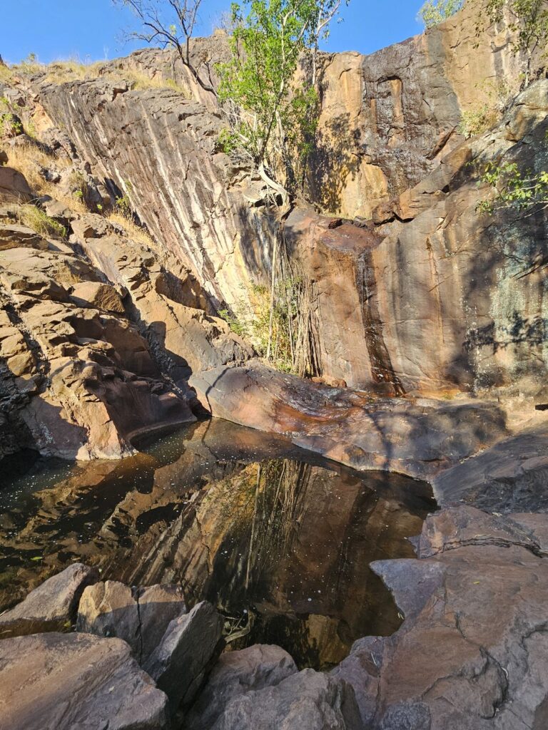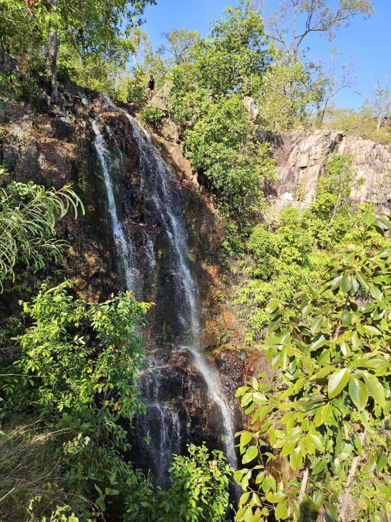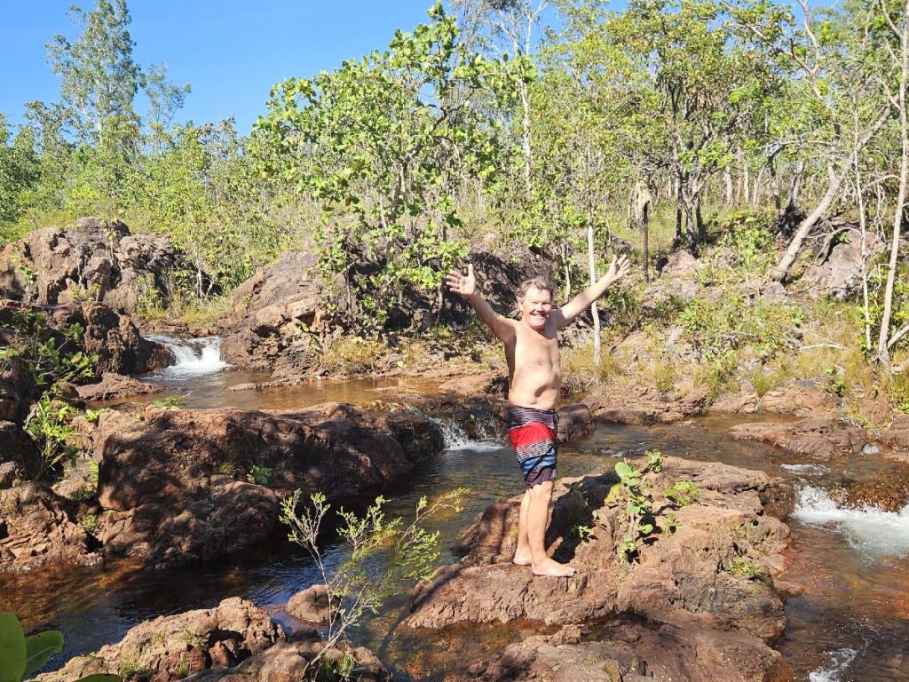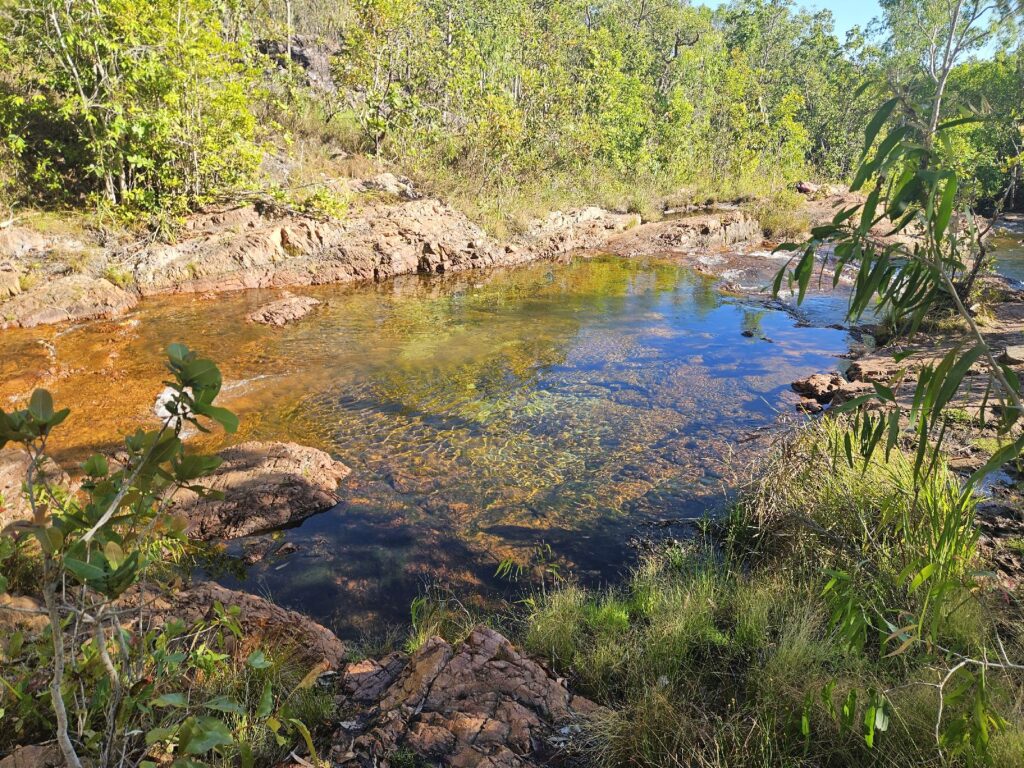 Mit dem Camper bereisen wir den gelb umrandeten Bereich. Ursprünglich waren nur der Litchfield und der Kakadu NP geplant (rot umrandetes Gebiet) Tipp: schau dir unsere bebilderte Reise in der gratis APP «POLARSTEPS» an (www.polarsteps.com) Nun der Reihe nach! Unsere Reise führt uns zunächst wie ursprünglich geplant Richtung Litchfield NP. Unterwegs fällt uns schon bald auf, dass offenbar viele Wälder von Waldbränden betroffen waren. Überall sehen wir deutliche Zeichen: angesengte Baumstämme, abgebranntes Unterholz und Gras. Wir erfahren, dass die Brände absichtlich von Menschenhand gelegt werden, um brennbares Material zu entfernen, solange es noch in geringer Menge vorhanden ist. Würde man das nicht machen, gäbe es viel mehr trockenes Holz und Gras. Ein etwa durch Blitzschlag entfachter Waldbrand würde dann schnell zu einer unkontrollierbaren, verheerenden Feuersbrunst ausarten. Schon bei den Ureinwohnern war es Tradition, zu Beginn der Trockenzeit kontrollierte Feuer zu legen, um auf diese Weise ihren Lebensraum gezielt zu pflegen und zu schützen. Die hier heimischen Pflanzen und viele Tiere haben sich an solche kleinere Feuer angepasst und können es überleben.Unser erster Stopp im Litchfield NP gilt der stillgelegten Zinn Miene von Bamboo Creek. Hier wurde in den 1940er Jahren während rund 12 Jahren unter härtesten Bedingungen Zinn abgebaut. Zwei der drei Besitzer der Miene verstarben Anfang der 50er Jahre an Lungenerkrankungen, die vom Staub in den Mienen verursacht wurden. Nachdem 1952 enorme Regenfälle die Stollen überfluteten, wurde der Zinn Abbau für immer eingestellt. Zurückgeblieben sind ein paar Einrichtungen, wie etwa das Steinbruchgebäude im Bild, wo das Erz mit dem Zinnvorkommen gebrochen und dann wie Gold ausgewaschen wurde.Innerhalb von kurzen Distanzen verändert sich die Landschaft schnell. Ausschlaggebend ist das Wasser. Bei Regenfall saugt der Boden aus Sandgestein das Wasser wie ein Schwamm auf. An der Oberfläche wird es schnell wieder trocken, entsprechend ist die Vegetation spärlich. Entlang von Flüssen und Wasserläufen ist die Vegetation dagegen tropisch und üppig.Das in den Sandfelsen aufgesaugte und gespeicherte Wasser wird an vielen kleinen, weit verstreuten Quellen wieder abgegeben. Auch in der höchsten Trockenzeit fliesst Wasser aus dem natürlichen Speicher. Die Wangi Wasserfälle (Bild) ergiessen sich vom Hochplateau in einen grossen Pool. Der perfekte Ort für ein kühlendes Bad.Bei den meisten Wasserfällen im Litchfield NP ist Baden möglich, da Krokodile die Höhendifferenz vom Meer und den tiefer gelegenen Sumpflandschaften schlecht überwinden können und deshalb in den höheren Gegenden selten sind. Allerdings, ohne Reptilien geht es auch hier nicht. Vor uns rennt dieser rund 1.2 Meter lange Gelbfleck-Waran ins Wasser.Ein paar Kilometer weiter im Litchfield NP folgen die Tjaetaba Wasserfälle. Das Besondere hier: die Quellen für diesen Wasserfall befinden sich nur unweit der oberen Kante und sind über einen kurzweiligen Wanderweg bequem erreichbar.Aus der Quelle oberhalb des Tjaetaba Wasserfalles sprudelt glasklares, kühles Wasser. Wunderbar für ein Fussbad. Ich bin mit Pia am Plaudern, als mich an den Füssen etwas kitzelt. Immer mehr. Nach kurzer Zeit krabbeln mehrere kleine Flussgarnelen an meinen Füssen herum und zupfen alte Hautreste weg. Eine perfekte Fusspflege.Pia verzichtet auf die Fusspflege.Das Gebiet der Tolmer Wasserfälle ist deshalb spannend, weil man hier sehr schön sieht, wie die Natur über mehrere Millionen Jahre gearbeitet hat. Das ganze nordaustralische Gebiet war einmal unter Wasser. Die Steinplatte ganz oben auf dem Berg ist ein Überbleibsel des damaligen Meeresbodens. Durch Wind, Wasser und Hitze der Sonne ist viel von den Sedimentschichten abgetragen worden. Das Regenwasser sickert durch Ritzen in den Boden bis zu wasserundurchlässigen Schichten, fliesst dann an deren Oberfläche entlang, bis es am Hang als Quelle wieder an die Oberfläche tritt. Dieses im Untergrund fliessende Wasser verursacht im Berginneren kleinere Hohlräume und Höhlen, die dann, sind sie einmal gross genug, zu Einbrüchen führen. Was bleibt, sind zerklüftete Berge und Schluchten mit plattenförmigem oder blockartigem Gestein.Tolmer Wasserfall. Das Wasser gelangt durch eine tief eingeschnittene Schlucht zur oberen Kante des Falles und stürzt dann 42 Meter in die Tiefe.Wir sind unterwegs zum Buley Rockhole (Litchfield NP). Auch hier wurde der Wald kürzlich durch Feuer von trockenem Gras und Holz befreit. Für unser Auge sehr öde. Nichts deutet darauf hin, dass schon in ein paar Monaten, wenn die Regenzeit (wet season) einsetzt, alles wieder grün sein soll.So sieht ein Pandanus Baum nach dem Feuer aus …… und so vorher. Der Aufbau des Stammes macht den Baum feuerresistent.Der Papier-Baum ist ebenfalls sehr widerstandsfähig. Seine mehrschichtige, papierartige Rinde, mehrere Zentimeter dick, schützt den Stamm vor Feuer, aber auch vor Insekten und anderen Tieren, die sich gern an Holz gütlich tun.Die rund 1.5 Kilometer lange Wanderung über verbrannte Erde lohnt sich. Wir gelangen zum Florence River mit mehreren aufeinander folgenden Pools mit glasklarem Wasser.Eine willkommene kühle ErfrischungIm ganzen nordaustralischen Territorium gibt es eine Regenzeit (wet season, November – April) und eine Trockenzeit (dry season, Mai bis Oktober). Die Pflanzen müssen sich sehr gut anpassen, um mit diesen grossen Unterschieden auszukommen. Dieser Farn auf den Felsen um uns herum kann das harsche Klima überleben, indem er 2 verschieden Arten von Blättern produziert. Während der Regenzeit wachsen die für Farne bekannten langen, leuchtendgrünen Wedel, die Sporen bilden und die Vermehrung der Pflanzen ermöglichen. Dies fallen während der Trockenzeit ab und es verbleiben nur die im Bild gezeigten papierartigen, braunen «Nestwedel». Obwohl sie nicht nach viel aussehen, sind sie die «Brotverdiener» der Pflanze.