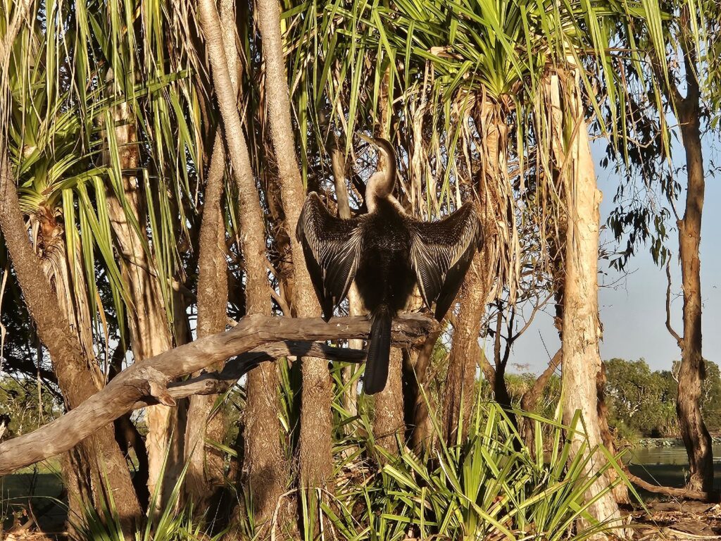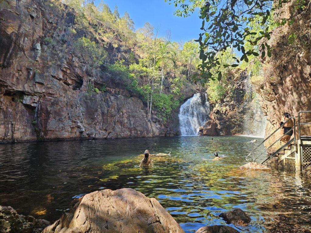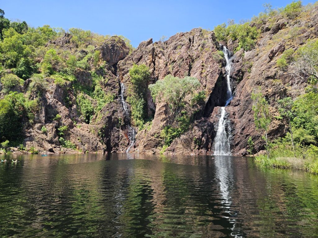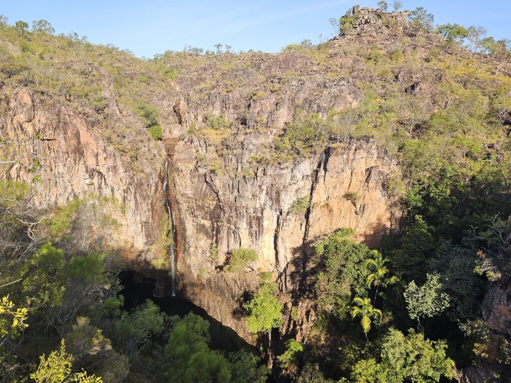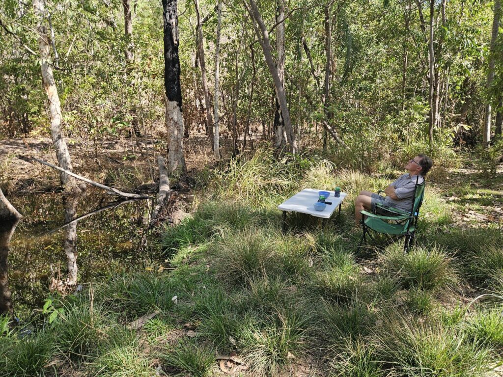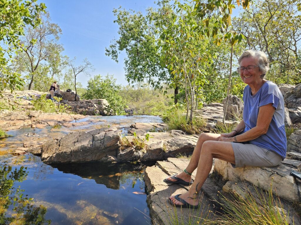 Mit dem Camper bereisen wir den gelb umrandeten Bereich. Ursprünglich waren nur der Litchfield und der Kakadu NP geplant (rot umrandetes Gebiet) Tipp: schau dir unsere bebilderte Reise in der gratis APP «POLARSTEPS» an (www.polarsteps.com) Nun der Reihe nach! Unsere Reise führt uns zunächst wie ursprünglich geplant Richtung Litchfield NP. Unterwegs fällt uns schon bald auf, dass offenbar viele Wälder von Waldbränden betroffen waren. Überall sehen wir deutliche Zeichen: angesengte Baumstämme, abgebranntes Unterholz und Gras. Wir erfahren, dass die Brände absichtlich von Menschenhand gelegt werden, um brennbares Material zu entfernen, solange es noch in geringer Menge vorhanden ist. Würde man das nicht machen, gäbe es viel mehr trockenes Holz und Gras. Ein etwa durch Blitzschlag entfachter Waldbrand würde dann schnell zu einer unkontrollierbaren, verheerenden Feuersbrunst ausarten. Schon bei den Ureinwohnern war es Tradition, zu Beginn der Trockenzeit kontrollierte Feuer zu legen, um auf diese Weise ihren Lebensraum gezielt zu pflegen und zu schützen. Die hier heimischen Pflanzen und viele Tiere haben sich an solche kleinere Feuer angepasst und können es überleben.Unser erster Stopp im Litchfield NP gilt der stillgelegten Zinn Miene von Bamboo Creek. Hier wurde in den 1940er Jahren während rund 12 Jahren unter härtesten Bedingungen Zinn abgebaut. Zwei der drei Besitzer der Miene verstarben Anfang der 50er Jahre an Lungenerkrankungen, die vom Staub in den Mienen verursacht wurden. Nachdem 1952 enorme Regenfälle die Stollen überfluteten, wurde der Zinn Abbau für immer eingestellt. Zurückgeblieben sind ein paar Einrichtungen, wie etwa das Steinbruchgebäude im Bild, wo das Erz mit dem Zinnvorkommen gebrochen und dann wie Gold ausgewaschen wurde.Innerhalb von kurzen Distanzen verändert sich die Landschaft schnell. Ausschlaggebend ist das Wasser. Bei Regenfall saugt der Boden aus Sandgestein das Wasser wie ein Schwamm auf. An der Oberfläche wird es schnell wieder trocken, entsprechend ist die Vegetation spärlich. Entlang von Flüssen und Wasserläufen ist die Vegetation dagegen tropisch und üppig.Das in den Sandfelsen aufgesaugte und gespeicherte Wasser wird an vielen kleinen, weit verstreuten Quellen wieder abgegeben. Auch in der höchsten Trockenzeit fliesst Wasser aus dem natürlichen Speicher. Die Wangi Wasserfälle (Bild) ergiessen sich vom Hochplateau in einen grossen Pool. Der perfekte Ort für ein kühlendes Bad.Bei den meisten Wasserfällen im Litchfield NP ist Baden möglich, da Krokodile die Höhendifferenz vom Meer und den tiefer gelegenen Sumpflandschaften schlecht überwinden können und deshalb in den höheren Gegenden selten sind. Allerdings, ohne Reptilien geht es auch hier nicht. Vor uns rennt dieser rund 1.2 Meter lange Gelbfleck-Waran ins Wasser.Ein paar Kilometer weiter im Litchfield NP folgen die Tjaetaba Wasserfälle. Das Besondere hier: die Quellen für diesen Wasserfall befinden sich nur unweit der oberen Kante und sind über einen kurzweiligen Wanderweg bequem erreichbar.Aus der Quelle oberhalb des Tjaetaba Wasserfalles sprudelt glasklares, kühles Wasser. Wunderbar für ein Fussbad. Ich bin mit Pia am Plaudern, als mich an den Füssen etwas kitzelt. Immer mehr. Nach kurzer Zeit krabbeln mehrere kleine Flussgarnelen an meinen Füssen herum und zupfen alte Hautreste weg. Eine perfekte Fusspflege.Pia verzichtet auf die Fusspflege.Das Gebiet der Tolmer Wasserfälle ist deshalb spannend, weil man hier sehr schön sieht, wie die Natur über mehrere Millionen Jahre gearbeitet hat. Das ganze nordaustralische Gebiet war einmal unter Wasser. Die Steinplatte ganz oben auf dem Berg ist ein Überbleibsel des damaligen Meeresbodens. Durch Wind, Wasser und Hitze der Sonne ist viel von den Sedimentschichten abgetragen worden. Das Regenwasser sickert durch Ritzen in den Boden bis zu wasserundurchlässigen Schichten, fliesst dann an deren Oberfläche entlang, bis es am Hang als Quelle wieder an die Oberfläche tritt. Dieses im Untergrund fliessende Wasser verursacht im Berginneren kleinere Hohlräume und Höhlen, die dann, sind sie einmal gross genug, zu Einbrüchen führen. Was bleibt, sind zerklüftete Berge und Schluchten mit plattenförmigem oder blockartigem Gestein.Tolmer Wasserfall. Das Wasser gelangt durch eine tief eingeschnittene Schlucht zur oberen Kante des Falles und stürzt dann 42 Meter in die Tiefe.Wir sind unterwegs zum Buley Rockhole (Litchfield NP). Auch hier wurde der Wald kürzlich durch Feuer von trockenem Gras und Holz befreit. Für unser Auge sehr öde. Nichts deutet darauf hin, dass schon in ein paar Monaten, wenn die Regenzeit (wet season) einsetzt, alles wieder grün sein soll.So sieht ein Pandanus Baum nach dem Feuer aus …… und so vorher. Der Aufbau des Stammes macht den Baum feuerresistent.Der Papier-Baum ist ebenfalls sehr widerstandsfähig. Seine mehrschichtige, papierartige Rinde, mehrere Zentimeter dick, schützt den Stamm vor Feuer, aber auch vor Insekten und anderen Tieren, die sich gern an Holz gütlich tun.Die rund 1.5 Kilometer lange Wanderung über verbrannte Erde lohnt sich. Wir gelangen zum Florence River mit mehreren aufeinander folgenden Pools mit glasklarem Wasser.Eine willkommene kühle ErfrischungIm ganzen nordaustralischen Territorium gibt es eine Regenzeit (wet season, November – April) und eine Trockenzeit (dry season, Mai bis Oktober). Die Pflanzen müssen sich sehr gut anpassen, um mit diesen grossen Unterschieden auszukommen. Dieser Farn auf den Felsen um uns herum kann das harsche Klima überleben, indem er 2 verschieden Arten von Blättern produziert. Während der Regenzeit wachsen die für Farne bekannten langen, leuchtendgrünen Wedel, die Sporen bilden und die Vermehrung der Pflanzen ermöglichen. Dies fallen während der Trockenzeit ab und es verbleiben nur die im Bild gezeigten papierartigen, braunen «Nestwedel». Obwohl sie nicht nach viel aussehen, sind sie die «Brotverdiener» der Pflanze.