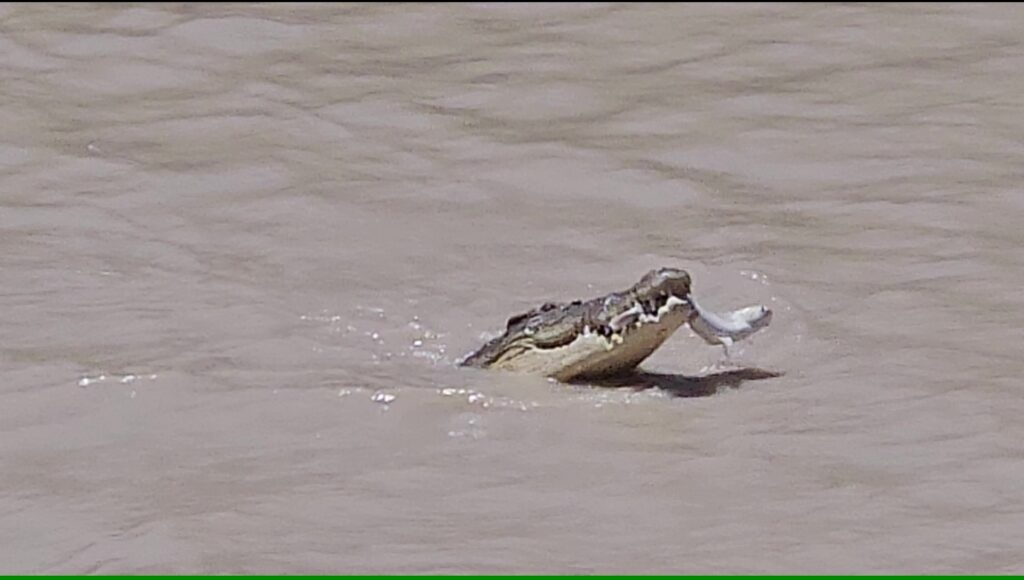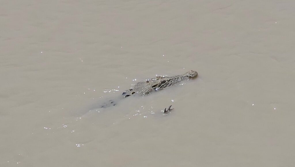Obwohl wir unterwegs immer wieder an wunderschönen, einladenden Sandstränden vorbeikommen, bleibt unser Dinghi die ganze Zeit fest verzurrt auf dem Schiff. Das hat zwei Gründe. Da ist einmal die Schwierigkeit, bei den hohen Gezeitenunterschieden und dem sehr flachen Meeresgrund anlanden zu können. Fahren wir bei Hochwasser an Land, steht unser Dinghi schon nach kurzer Zeit weit weg vom Wasserrand, und wir hätten Probleme, es wieder einwassern zu können. Optimal wäre, eine Stunde vor Hochwasser so weit wie möglich ans Land zu fahren, und das Dinghi dort mit einem Anker zu sichern. Dann hätten wir zwei Stunden später wieder genau denselben Wasserstand. Das bringt uns aber zum zweiten und wesentlichen Grund, weshalb wir keine Landgänge machen: die Krokodile! Wir müssten durch das seichte, trübe Wasser stapfen, wo es unmöglich ist, eine allfällige Gefahr rechtzeitig zu erkennen.