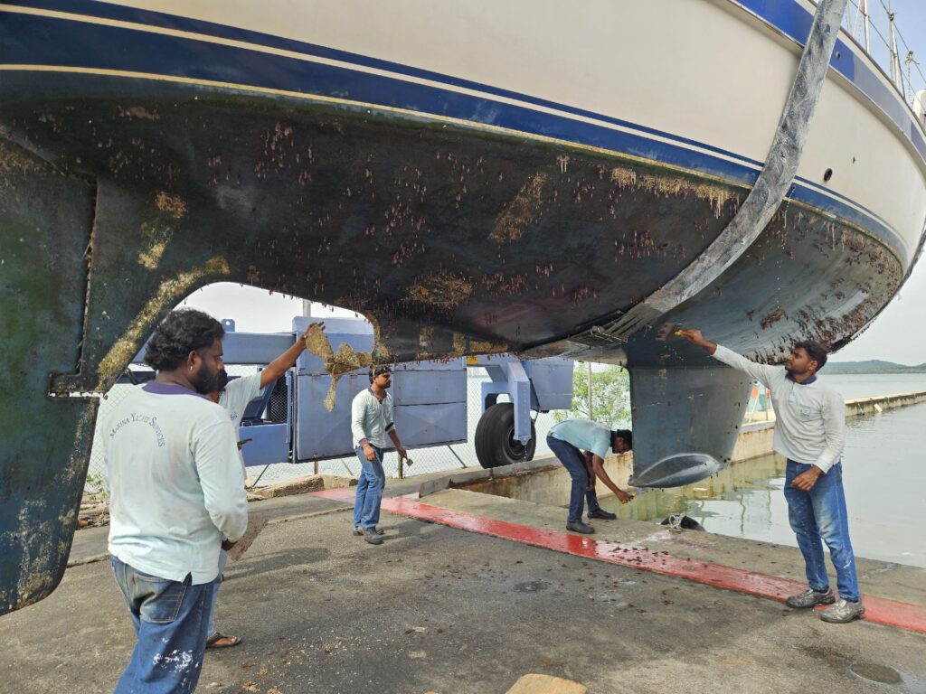 Der Haken daran: die Zufahrt zum Spot On Boat Yard (Werft) ist sehr seicht und für uns nur bei Hochwasser befahrbar. Bei Niedrigwasser fällt die ganze Strecke sogar trocken (alle grünen Felder fallen bei Ebbe trocken).Lupina wird ausgewassert – so schlecht sieht das Unterwasserschiff ja gar nicht aus!Ein Biosecurity Manager des Departments of Agriculture und Fisheries (Landwirtschaft und Fischerei) wurde am Tag vorher bereits informiert und begutachtet nun vor der Hochdruckreinigung die Tierchen Vielfalt, die da am Bauch unserer Lupina herumtollt. Eine eigentlich sehr interessante und eindrückliche Sache. Der Beamte ist äussert zuvorkommend und nett und erklärt uns viel. Er erwähnt auch, dass er nichts Kritisches finden kann. Aber wie heisst es doch so schön: Vorbeugen ist besser als Heilen!Die Reinigung des Schiffes mit Hochdruckabdampfanlage verfolgen wir dann nicht mehr. Stattdessen verbringen wir den Rest des Tages damit, der sengenden Sonne möglichst aus dem Weg zu gehen, herrschen doch tagsüber in diesen Breitengraden bereits über 30 Grad im Schatten. Wir packen die Gelegenheit beim Schopf und besuchen am «East Point» von Darwin das sehr interessante und gut bestückte Militärmuseum, das wir erst am Nachmittag wieder verlassen.Die Werft hat einen guten Job gemacht. Ausser Farbe befindet sich nichts mehr an unserem Unterwasserschiff.