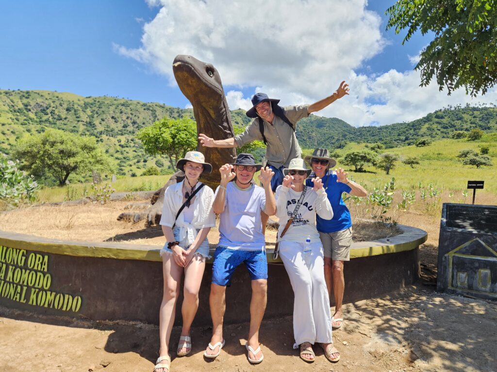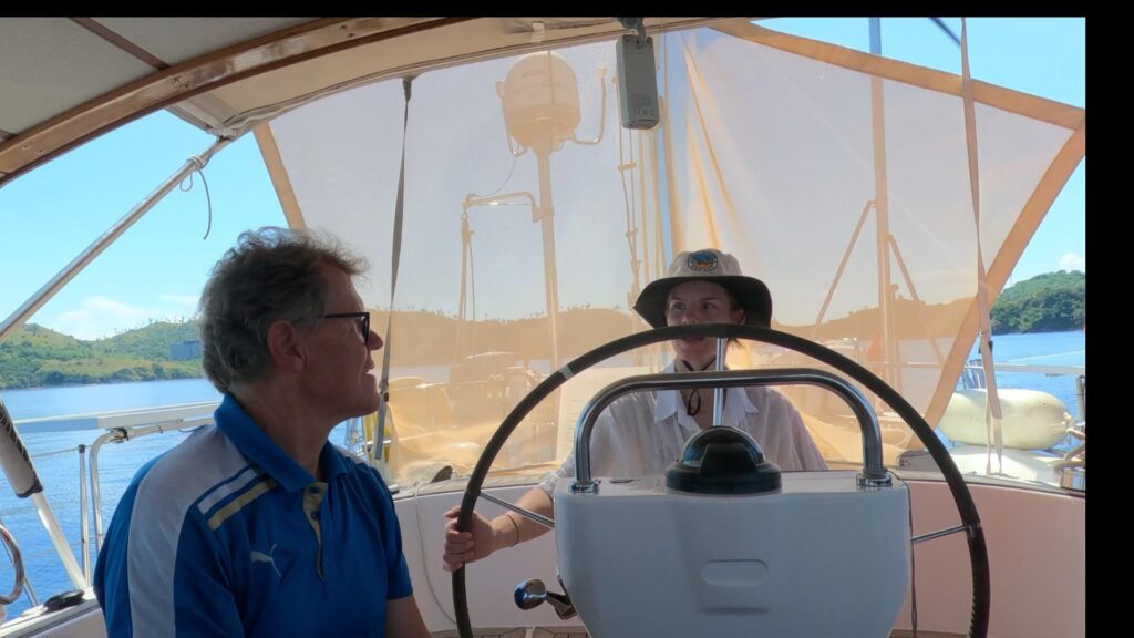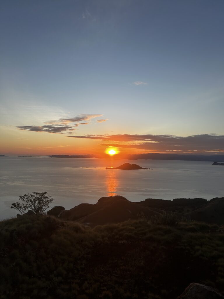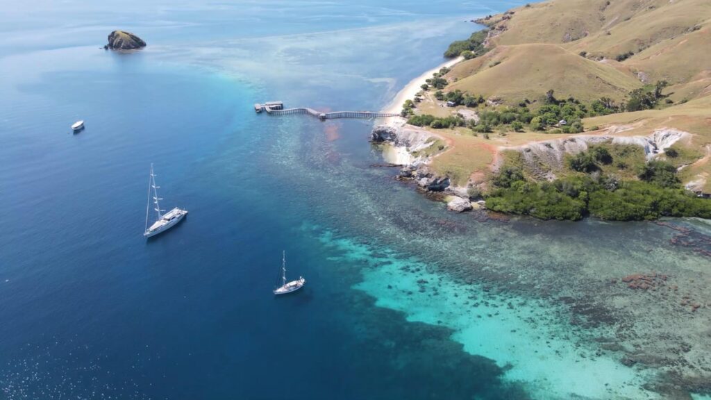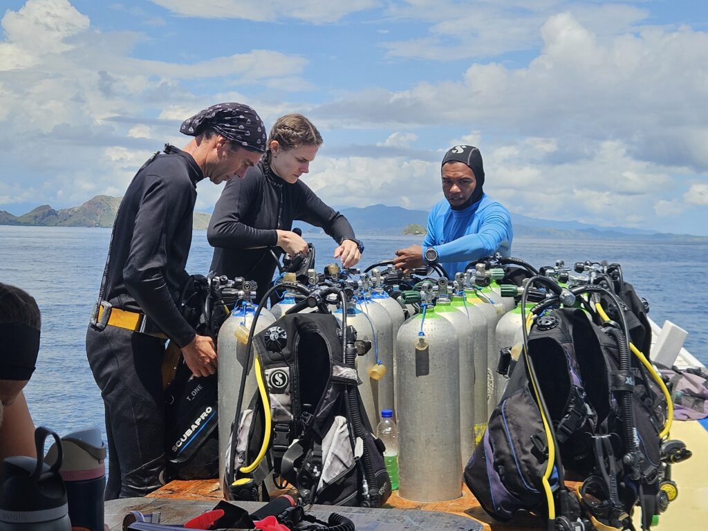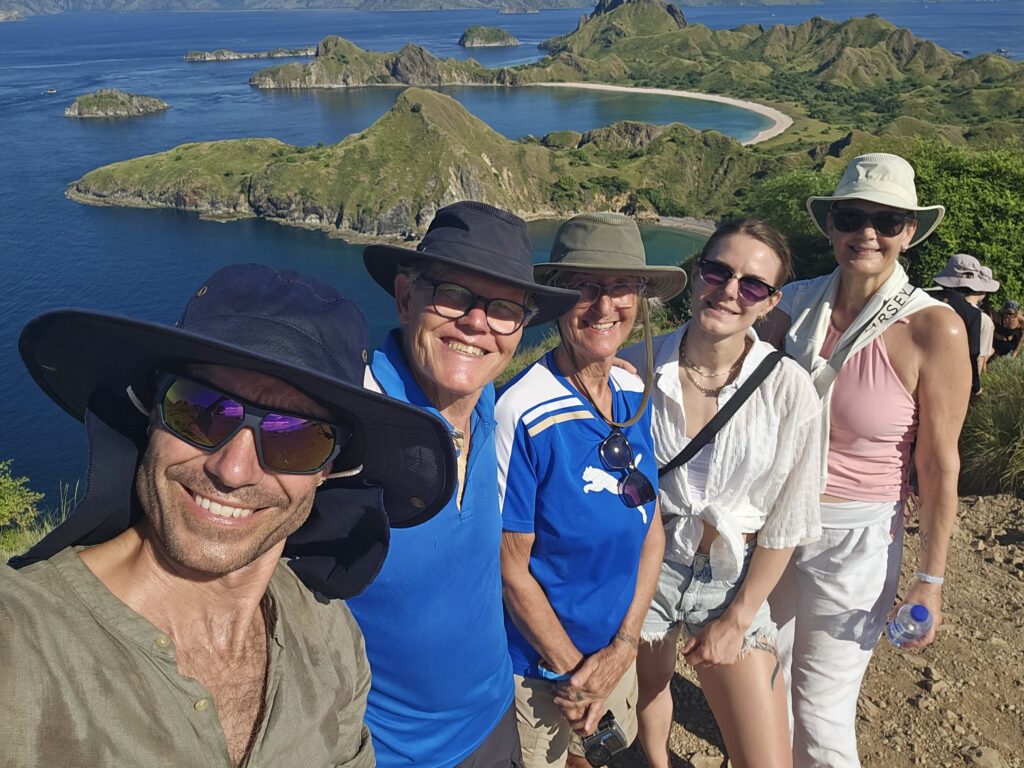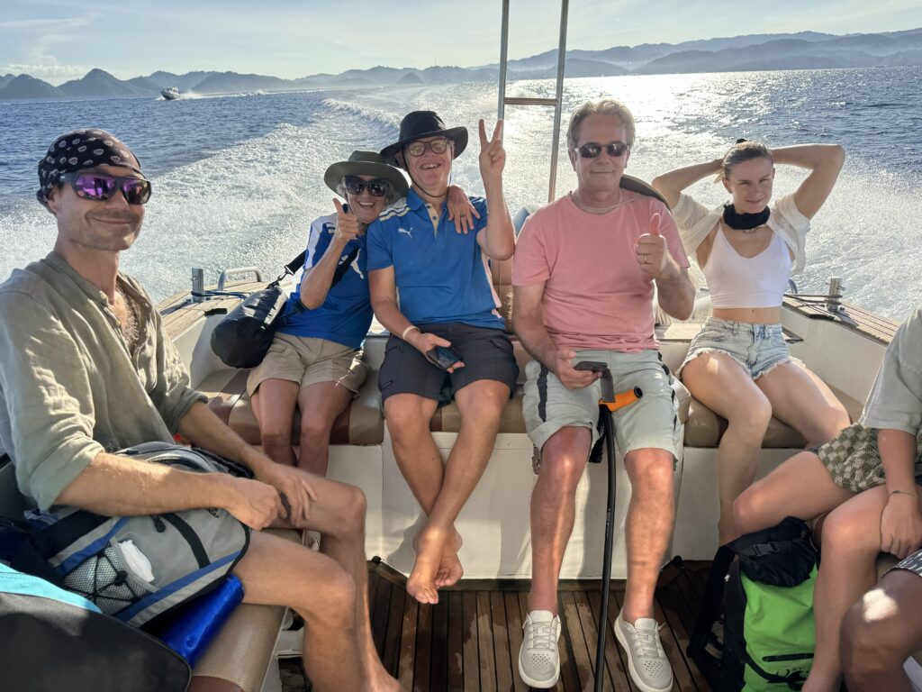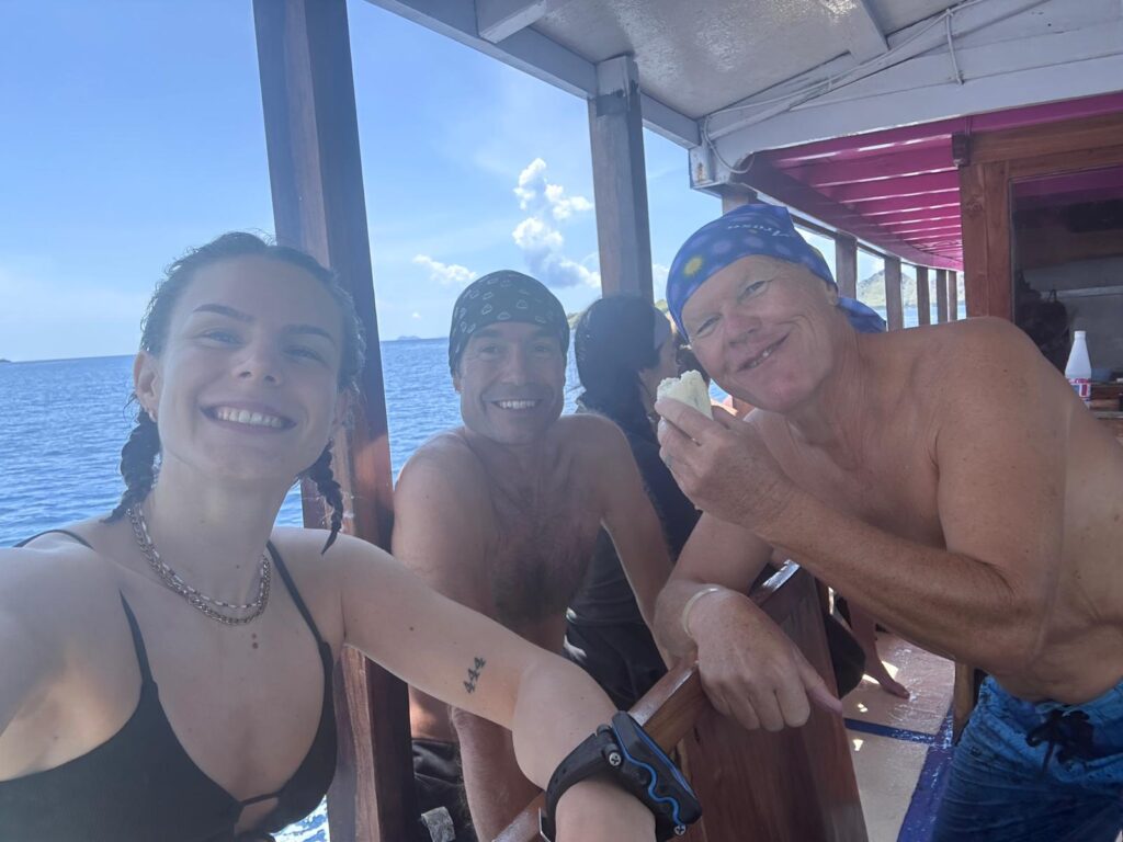 Es geht direkt zur Bucht auf die Lupina – mit 3 Gästen und viel Gepäck ist das Dinghi ganz schön gefordert.Dann natürlich der obligatorische Welcome Drink.Und abends schon ein wundervoller Sonnenuntergang beim Essen an Land.Tara darf am nächsten Tag schon mit Robin (unserem Vorgänger auf der Lupina) ihren Tauchkurs beginnen. Das Ganze fängt erst mal an im Pool. Für Köbi gibt es ebenfalls eine Auffrischung seiner Tauchskills.Bereits am folgenden Tag geht es für die Tauch-Crew (Köbi, Robin und Tara) ins offene Meer.Speziell für Tara und Robin ein unvergessliches Erlebnis.Umgeben von Mantarochen ….…. wunderschönen Korallenriffen und farbenfrohen Fischen wohin das Auge reicht, kann man sich kaum satt sehen.Robin und Tara bleiben für einige Tage im Tauchkurs und wir ziehen uns auf die Lupina zurück und lassen die Leinen los. Zu einem traumhaften Ankerplatz bei der Insel Sebabi – wo der Ankertrunk gleich auch zum Sundowner wird.Wir bleiben – es ist soooooo schön hier!!Fast kitschig – die Fotos sehen aus wie KI. Köbi lässt seit langem wieder einmal mit Dani die Drohne steigen – und so entstehen Postkartenföteli am Band … und wir geniessen den nahen Strand und die Ruhe, denn wir sind alleine auf weiter Flur.Nur umgeben von vielen Fischern, die mit ihren Knatterkuttern an uns vorbeiziehen. Auffällig: im Gegensatz zu anderen Ländern sind sie hier von oben bis unten eingemummelt.Wir machen es uns zwischendurch am Strand gemütlich, wo vermutlich Einheimische eine kleine «Unterkunft» gebaut haben – ideal zum Chillen und snacken …Während dessen gehen Robin und Tara weiterhin die Unterwasserwelt erkunden.Wie soll es auch anders sein – sie treffen im Tauchkurs auf andere Schweizer.Der Tauchplatz Batu Bolong (Loch im Felsen) gehört aufgrund seiner Artenvielfalt zu den 10 schönsten Tauchplätzen der Welt !Tara hatte während dem Tauchkurs einen Tag frei und nutzte diesen, um den Wasserfall Cunca Wulang zu erkunden. Die Fahrt dorthin mit dem Motorrad machte das Erlebnis besonders aufregend.Nachdem Robin und Tara ihre Tauchkurse (OW, AOW, und Enriched Air) abgeschlossen hatten, ging es für uns alle gleich am nächsten Tag auf eine Speed-Boat-Tour.Ein verschwitztes Gruppenfoto nach über 800 Treppenstufen darf natürlich nicht fehlen. Für die Aussicht hat es sich aber absolut gelohnt!Der nächste Stopp unserer Tour brachte uns direkt auf die Komodo Insel, wo wir die so genannten ‘Komodo Dragons’ in ihrer natürlichen Umgebung erleben durften. Mit drei !! lokalen Guides pro Gruppe natürlich, weil die Biester echt gefährlich sind. Fun Fact: ein Komodowaran kann eine Geschwindigkeit von über 20 km/h erreichen und ihr Biss ist giftig. Ausgewachsen können sie bis zu drei Meter lang werden und ein Gewicht von bis zu 150 kg erreichen – etwas Sicherheitsabstand lohnt sich also. Daher posieren wir als Gruppe mal lieber mit einer überlebensgrossen Statue.Weiter führte uns die Tour zu einer Sandbank, die gerade so über die Wasseroberfläche ragte – und das mitten im Ozean.Am Tag nach der Speed-Boat-Tour verabschiedeten wir uns vorübergehend von Flores und machten uns auch den Weg nach Westen. Mit Tara am Steuer ! (Sorgfältig überwacht vom Captain)An unserer Destination bei Sebayur Besar angekommen, durfte das Auskundschaften des Ankerplatzes, sowie eine kurze Yoga Einheit nicht fehlen.Unser Sundowner-Plätzchen am Strand inklusive Lagerfeuer spricht für sich.Das nächste Sonnenspektakel folgte bereits am nächsten Morgen. Pia, Köbi und Tara machten sich früh auf den Weg, um den Sonnenaufgang auf dem höchsten Punkt der Insel zu erwischen.Die kleine Erfrischung nach dem Anstieg tat gut!Dann geht’s zurück nach Labuan Bajo, wo schon der nächste Ausflug wartet. Wir haben online einen Fahrer gebucht, der uns in der Umgebung zu speziellen Plätzen fährt. Erster Stopp: die Batu Payung Höhle, die erst in den 50-er Jahren von einem Holländer entdeckt wurde und spannende Felsformationen bietet.Batu Payung (Patu = Stein / Payung = Schirm) ist ein passender Name die Touristenattraktion.… und schon ab zur nächsten Höhle – die Rangko Cave erreicht man nur per Boot und einem kleinen Fussmarsch– und es ist spektakulär darin zu baden. Echt ein Erlebnis!Immer nah beobachtet von Affen geht’s zur nächsten Attraktion.Der Sylvia Hill ist ein weiterer Aussichtspunkt, den man sich allerdings auch hart und schweisstreibend erarbeiten muss! Die Sonne knallt von oben, kaum Wind und eine brutale Hitze …. trotzdem muss es fast sein, denn von hier oben hat man eine wunderschöne Aussicht über ganz Labuan Bajo.