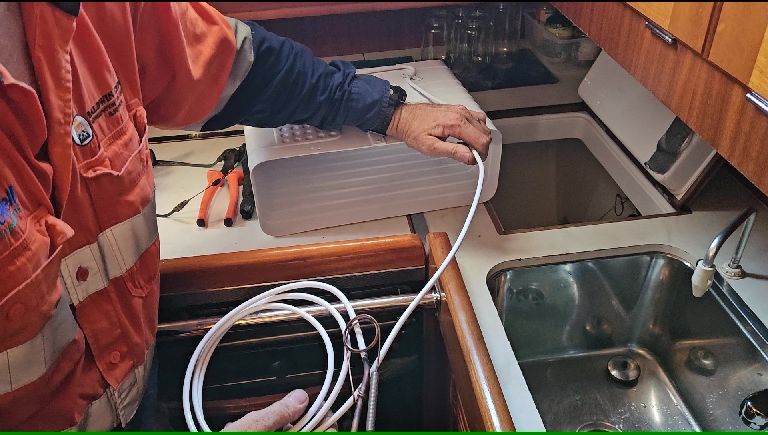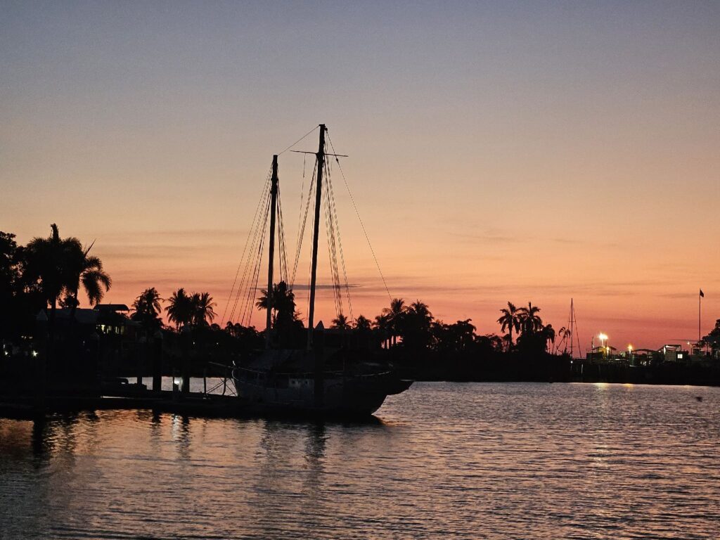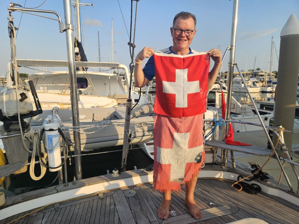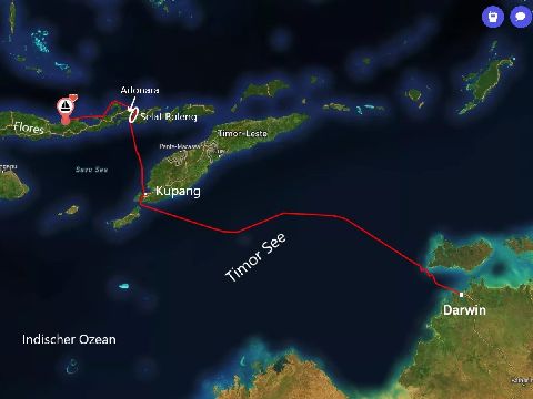 In diesem Bericht nehmen wir dich mit auf die Überfahrt von Darwin (Australien) nach Indonesien. Die Kleinstadt Kupang auf West Timor ist unsere erste Anlaufstelle, wo wir das Einklarieren vornehmen wollen. Danach segeln wir zunächst weiter nordwärts, schlängeln uns durch die Inseln östlich von Flores durch, um dann westwärts abzubiegen und der Nordküste von Flores zu folgen.Aber alles der Reihe nach. Lupina freut sich über unsere Rückkehr vom Landausflug ins rote Zentrum des Australischen Kontinentes und liegt ruhig am Pier der Cullen Bay Marina in Darwin (Schiff links am Pier). Sie wartet allerdings mit einer Überraschung auf uns: der Kühlschrank kühlt nicht mehr. Kurzer Schock, denn wir haben unsere Ausklarierung mit den Behörden auf den kommenden Dienstag, 7.10.2025 festgelegt. Nur ein Woche Zeit um den Kühlschrank zu reparieren! Ob das reicht?Über das Marina Büro erhalten wir eine Telefon Nummer, wo wir Hilfe bekommen können. Wir haben Glück! Noch am selben Tag unseres Anrufes kommt ein Service-Techniker vorbei. Schnell findet er heraus, dass unser Verdampfer (das rechteckige Kühlelement im Bild) eine Leckage hat und ersetzt werden muss. Der Hersteller hat eine Vertretung in Australien und der hat tatsächlich ein Ersatz an Lager. Per Express wird das Teil innerhalb weniger Tage nach Darwin geschickt und am Freitag vor unserer Abreise eingebaut.Der Kühlschrank ist wirklich im richtigen Ort ausgestiegen. Der Techniker, der uns das Gerät repariert, ist ein absoluter Profi. Er hat von Angang an alles nötige Werkzeug dabei. Das Problem, das ihm der Hersteller gemacht hat, löst er nach kurzer Rücksprache meisterlich: die Anschlüsse des neuen Gerätes haben eine andere Dimension. Kurzerhand trennt es diese ab und lötet die Leitungen einfach zusammen. System neu befüllt und auf Druckverlust und Leckage getestet – alles gut. Am Samstagnachmittag ist unser Kühlschrank repariert – der Abreise steht nichts mehr im Wege.Trotz der Hektik um den Kühlschrank können wir das Zusammensein mit anderen Seglern, die wir hier in der Marina treffen, geniessen. Marianne und Uwe sind wie wir mit ihrem Segelschiff «Pangaea» auf Weltreise. Über andere Segler sind sie auf uns aufmerksam geworden und haben uns angeschrieben. Nun treffen wir das sympathische Paar, das in der Schweiz lebt, in Darwin zum ersten Mal und verstehen uns gleich auf Anhieb.Dann ist es soweit: der letzte Sonnenuntergang in der Cullen Bay Marina. Morgen, am 7.10.2025, geht es los!Bei Sonnenaufgang werden bekanntlich die Fahnen gehisst. Ist auch bei uns so. Heute, am Tag der Abreise, wird aber die Alte, die uns über ein Jahr gedient hat, durch eine Neue ersetzt.