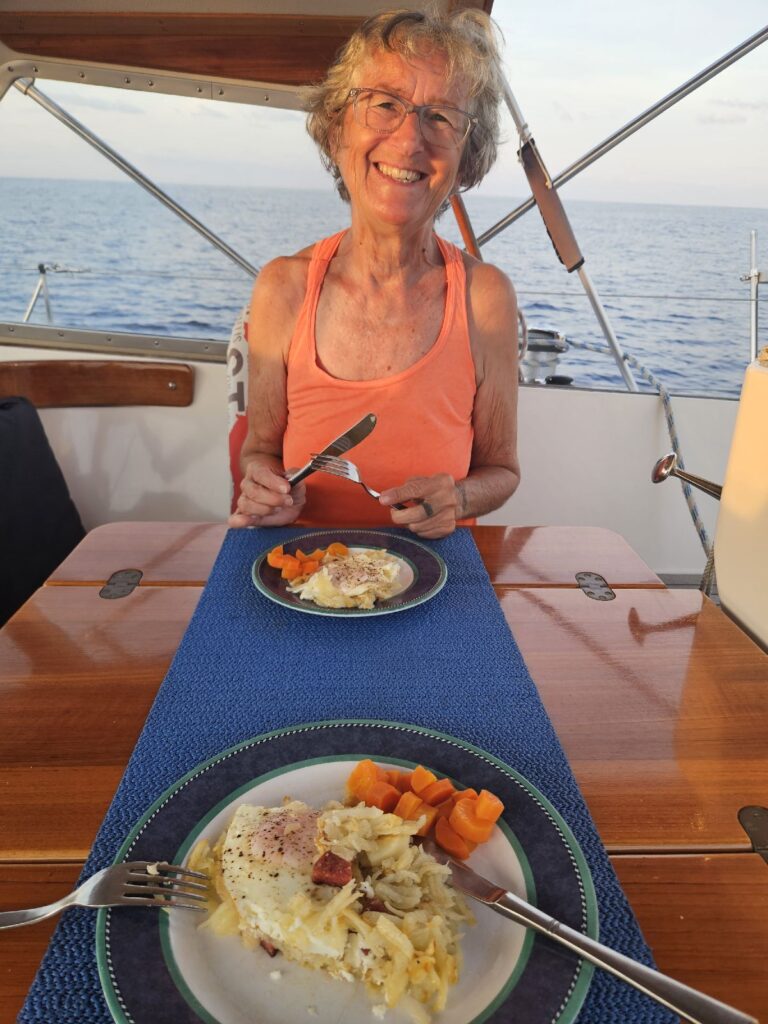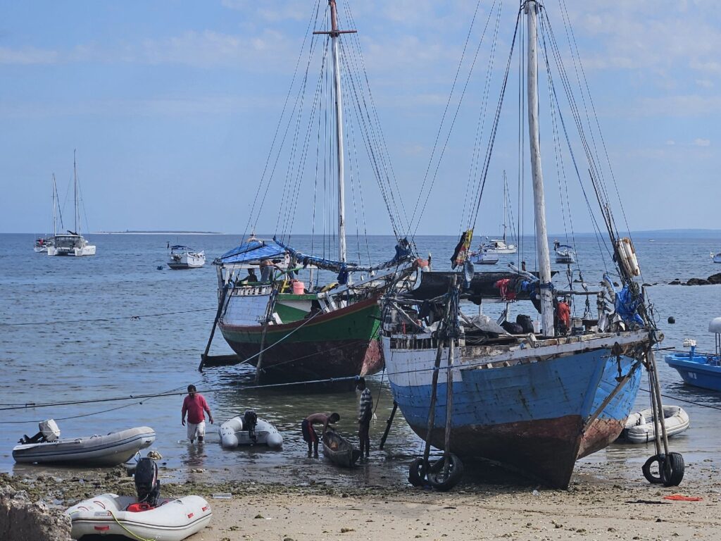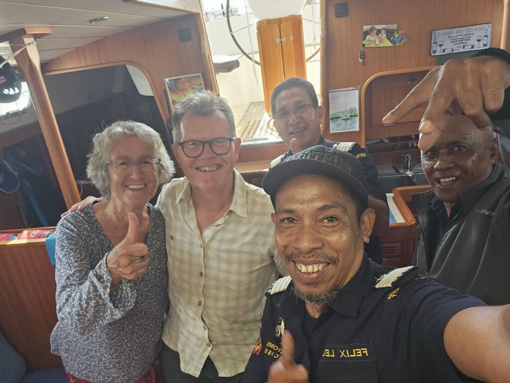 Kühlschrank läuft – gestempelte Ausklarierungspapiere in der Hand – 500 Seemeilen warten auf uns. Aber der Wind lässt uns im Stich! Die ersten Stunden können wir zwar segeln, jedoch kommt der Wind mehrheitlich auf die Nase und wir müssen aufkreuzen. Bei wenig Wind ist das aber nicht so schlimm. Kurz nach Mitternacht des ersten Tages fällt der Wind dann ganz zusammen und wir müssen unseren Kari, den Motor, starten. Auch bei Sonnenaufgang (Bild) zeigt sich kein Lüftchen, dafür ist das Meer absolut flach.Wir wählen absichtlich eine nördliche Route, weil uns da die Wetterprogramme Wind versprechen. Fehlanzeige! Rund 32 Stunden lang brummt der Motor gemütlich vor sich hin. Ein Frust für einen Segler! Aber alles hat auch seine guten Seiten: in unserem Fall ist es eine fantastisch gute Rösti, die Pia bei ruhigem Seegang von der Bordküche auf den Tisch zaubert.Dann endlich, gegen Abend des 2. Tages auf See kräuseln sich die Wellen, der Himmel klart auf und Wind setzt ein.Von nun an geht die Reise unter Segeln weiter. Nicht schnell zwar, aber immerhin, wir können segeln. Im Morgengrauen des 4. Tages auf See erscheint Timor am Horizont.Hatten wir bei den letzten längeren Überfahrten immer Glück und sind jeweils ohne Probleme und Ausfälle durchgekommen, gibt es bei dieser Überfahrt zwei bösere Überraschungen. Bei einer Routinekontrolle entdecke ich, dass die Wellendichtung defekt ist und ihre Aufgabe nicht mehr erfüllt: Wassereintritt!! (deutlich zu sehen im Bild). Nach kurzem Schock setzt das rationale Denken wieder ein. Das Schiff geht nicht gleich unter deswegen. Das Wasser läuft dem Boden entlang in die Bilge, dem tiefsten Punkt im Schiff. Dort ist eine elektrische Pumpe installiert, die sich automatisch einschaltet, wenn ein bestimmtes Niveau erreicht ist. Kurzer Check: ja, sie funktioniert. Somit können wir vorerst weiter Segeln, müssen die Entwicklung aber genau verfolgen.Ich habe von zwei bösen Überraschungen gesprochen. Nun, die Zweite ist nicht so gefährlich wie die Erste, und wir können eine Lösung finden. Der «Mastervolt» Stromtransformer (montiert im Motorraum, markiert mit dem gelben Pfeil) gibt unterwegs mit einem lauten Knall den Geist auf. Das Gerät brauchen wir, um von 12 Volt der Batterie 220 Volt für unsere Verbraucher (zum Beispiel die Computer) zu bekommen. Ich finde eine Lösung bei unseren Ersatzteilen. Ich habe mal einen 110 Volt Transformer gekauft, den ich nun wieder aktiviere. Alle Geräte, die den Strom von 220 Volt mit Ladegeräten wieder runter auf 5 Volt, oder was auch immer sie brauchen, transformieren, funktionieren auch mit 110V. Probleme vorerst umschifft und wir sind in der Zieleinfahrt – die gute Laune ist zurück.Es ist Zeit, die Indonesische und die gelbe Quarantäne Flaggen zu hissen.Beim ersten Kontakt mit Indonesiern merken wir: wir sind in einem anderen Land! So schön – hier winken einem die Leute wieder zu, lachen einem an. Etwas, was uns in Australien sehr gefehlt hat.In Kupang angekommen werden wir von der Quarantäne-Behörde aufgefordert, sie am Land abzuholen und mit unserem Dinghi zum Schiff zu bringen. Es herrsch ein emsiges Treiben. Zwischen zwei trocken gefallenen Fischerbooten können wir an Land gehen. Wir treffen einen Service an, denn wir noch nie hatten: der Mann im roten Hemd nimmt uns gleich in Empfang, befestigt unser Dinghi an einem seiner Steine und bewacht es die ganze Zeit, in der wir an Land sind. Bei einem Tidenhub von rund zwei Metern eine sehr beruhigende und willkommene Dienstleistung.Die zwei Männer der Quarantäne haben ihren Papierkram an Bord schnell erledigt, und wir tauschen sie mit unserem Dinghi gegen die Beamten vom Zoll aus. Im Gegensatz zu den ersten Besuchern erledigen diese ihren Auftrag sehr professionell.Zum Abschuss der Kontrolle ein Gruppenbild. Selfies machen ist eine ausgeprägte Leidenschaft der Indonesier, wie wir schnell merken werden.