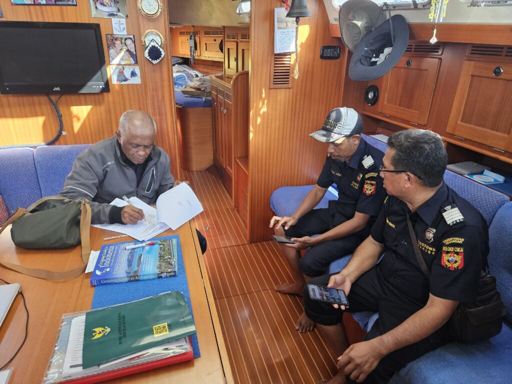Pünktlich um 9 Uhr erscheinen die Behörden, aber das Ausklarieren in Darwin wird zur Tortur: über eine Stunde lang durchwühlen 4 Beamte der Australischen Zollbehörde unsere Lupina. Sie sind zwar sehr freundlich und erklären uns bereitwillig, warum sie jedes Schiff so genau untersuchen müssen. So richtig begreifen tun wir es bis heute nicht, denn beim Einklarieren in Gold Coast kam nur ein Beamte kurz an Bord und hat gar nichts angeschaut. Wie wenn wir etwas aus Australien illegal entführen wollten. Egal: nachdem wir gut eine Stunde auf dem Pier neben der Lupina gestanden sind (wir durften während der Wühlaktion nicht an Bord sein), geben uns die Beamten das Schiff zurück und wir dürfen endlich lossegeln. Unseren Freunden von der SY Kama, die direkt nach uns ausklarieren, ergeht es genau gleich: auch sie erleben eine einstündige, akribische Durchsuchung des Schiffes.